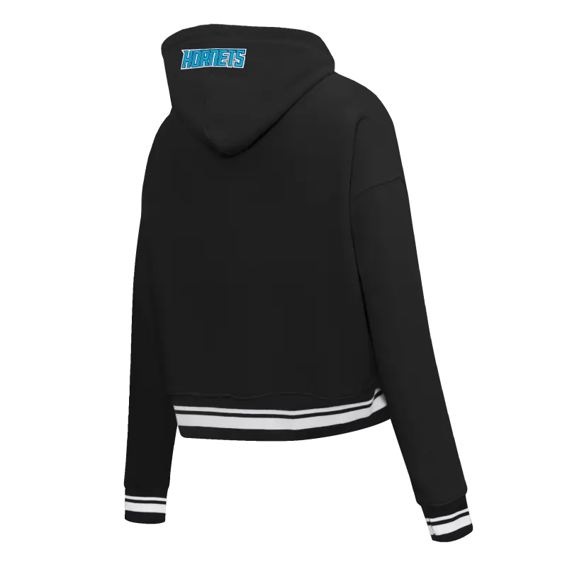 NBA CHARLOTTE HORNETS SCRIPT TAIL WOMEN’S RIB FLEECE CROPPED PULLOVER HOODIE (BLACK)
